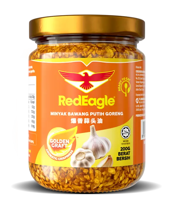Minyak Bawang Putih Goreng Red Eagle menggunakan proses menggoreng dan pengedapan yang jitu untuk mengunci kesegaran, menjamin bawang putih goreng kekal rangup walaupun terendam di dalam minyak.